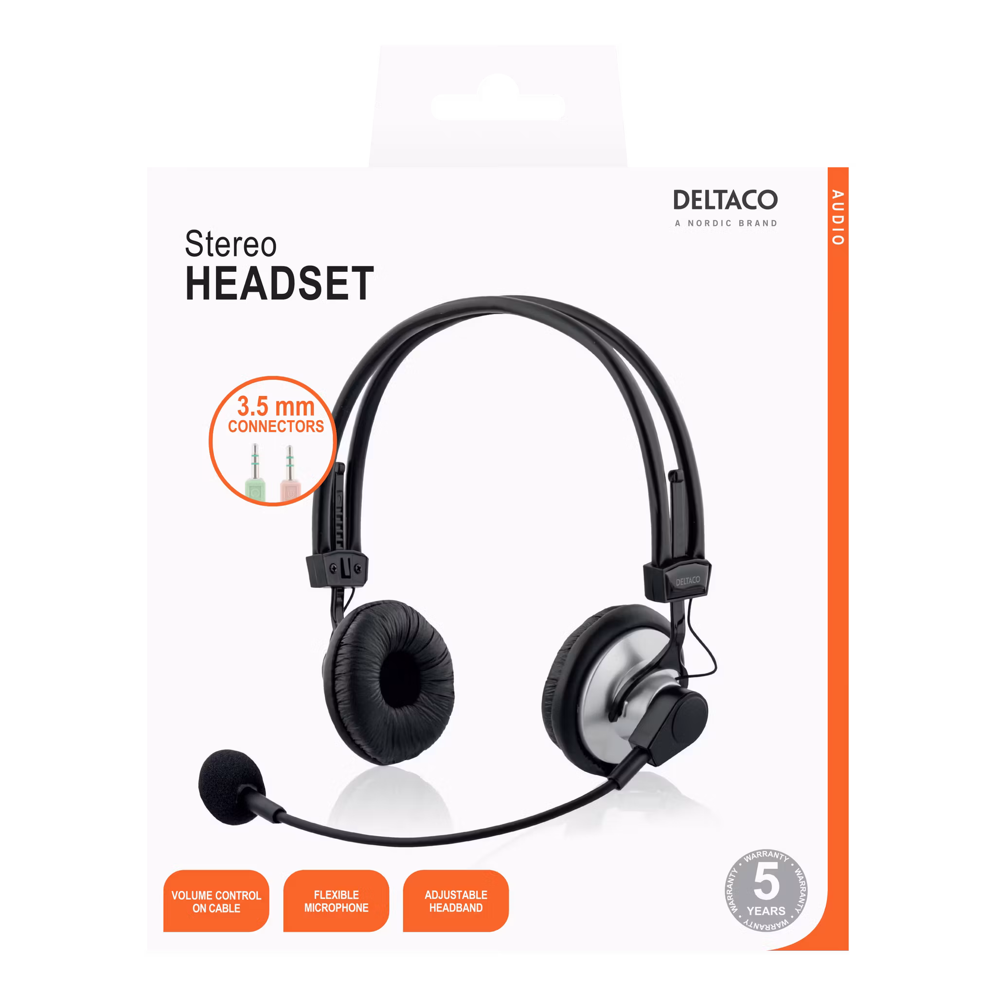 DELTACO HL-7 Headset – 3,5 mm, Volymkontroll & Bommikrofon