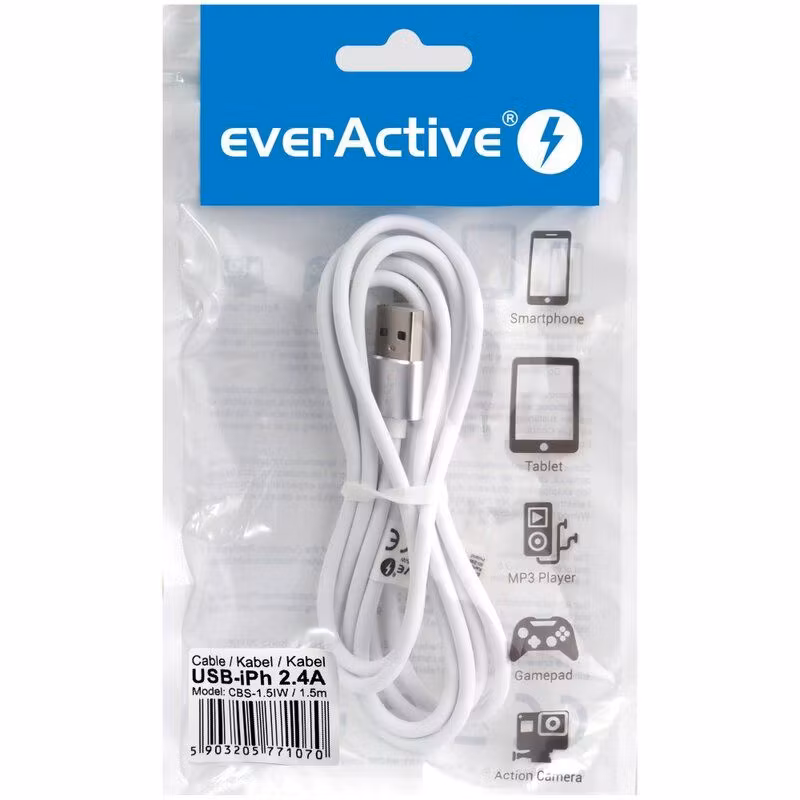 USB -silikonkabel - Lightning / iPhone everActive CBS -1.5IW 150cm med stöd för snabb laddning upp till 2,4A vit