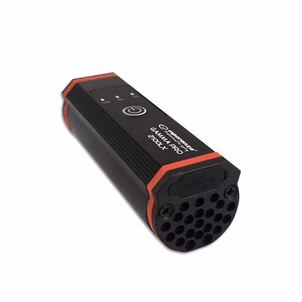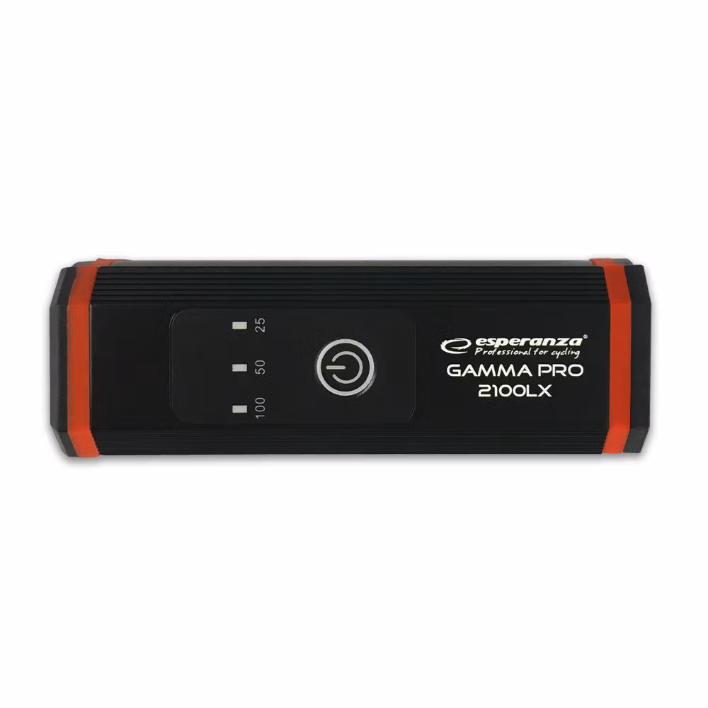 2 i 1 professionell, vattentät cykellampa och ficklampa Esperanza PRO GAMMA 2100 LX har en stark vit LED-diod typ CREE T6, som avger ett starkt ljus med en effekt på 2100 lx i MAX-läge. Superstarkt ljus kommer jämnt att lysa upp vägen upp till 200 m framför dig och är synligt från över 2000 m. Lampan kan arbeta upp till 150 minuter i MAX-läget. Den har fem inbyggda belysningslägen som kan ändras genom att trycka på strömknappen. Inbyggt batteri, laddat via micro USB, med en mycket stor kapacitet på 2200 mAh, gör att du kan använda lampan i upp till 300 minuter i SUPER ECONO-läge. Den har batteriladdningsindikator.