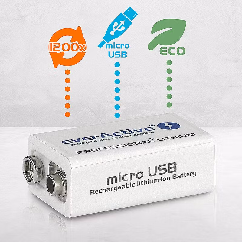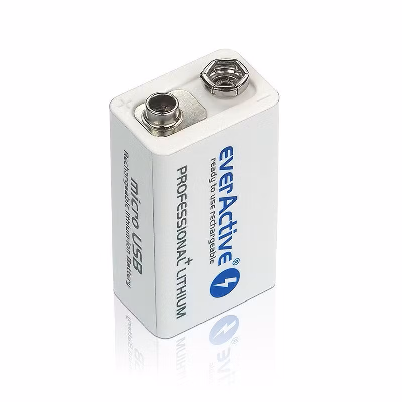 EverActive-batterier i storlek på ett 9V-batteri tillverkat i Li-ion-teknik kan laddas med vilken mikro-USB-laddare som helst - batteriet har en inbyggd styrenhet som säkerställer säker laddning och dessutom skyddar elektroniskt hela batteriet under drift.