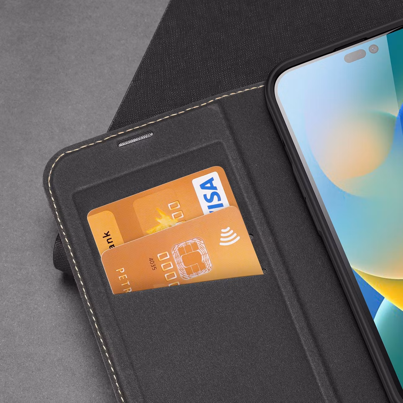Inuti hittar du även en ficka för ett betalkort eller dokument. Klaffen stängs tack vare magneterna inbyggda i kanten. Tack vare detta undviker du att öppna fodralet av misstag.